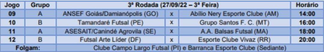 A terceira rodada da Taça Brasil de Futsal Adulto ocorre nesta segunda-feira (26), a partir das 14h, com quatro partidas, no Ginásio Internacional Newton de Faria, em Anápolis. Veja os confrontos.