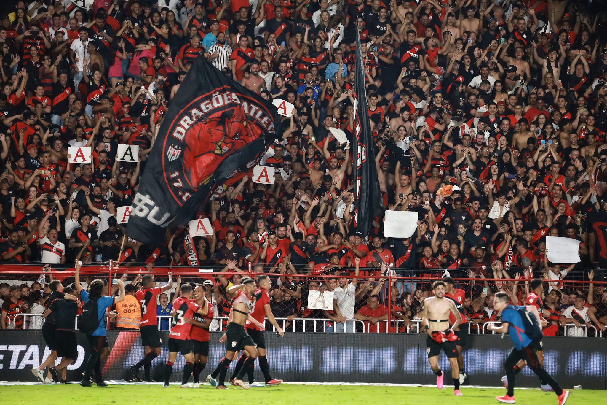 Com uma foto de um torcedor segurando um cartaz com a letra A, o perfil do Atlético-GO não perdeu tempo. Isso porque o Dragão terminou a Série B de 2023 em 4º lugar e vai disputar a elite nacional no ano que vem. Enquanto isso, o Goiás figura em 18º na atual edição da Série A e está muito próximo do rebaixamento.