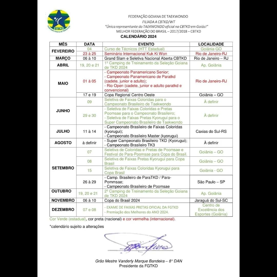A Federação Goiana de Taekwondo (FGTKD) divulgou nesta quinta-feira (4) o calendário da modalidade no estado para a temporada de 2024. O primeiro evento previsto é no dia 4 de fevereiro, com um curso de técnicos, em Goiânia.